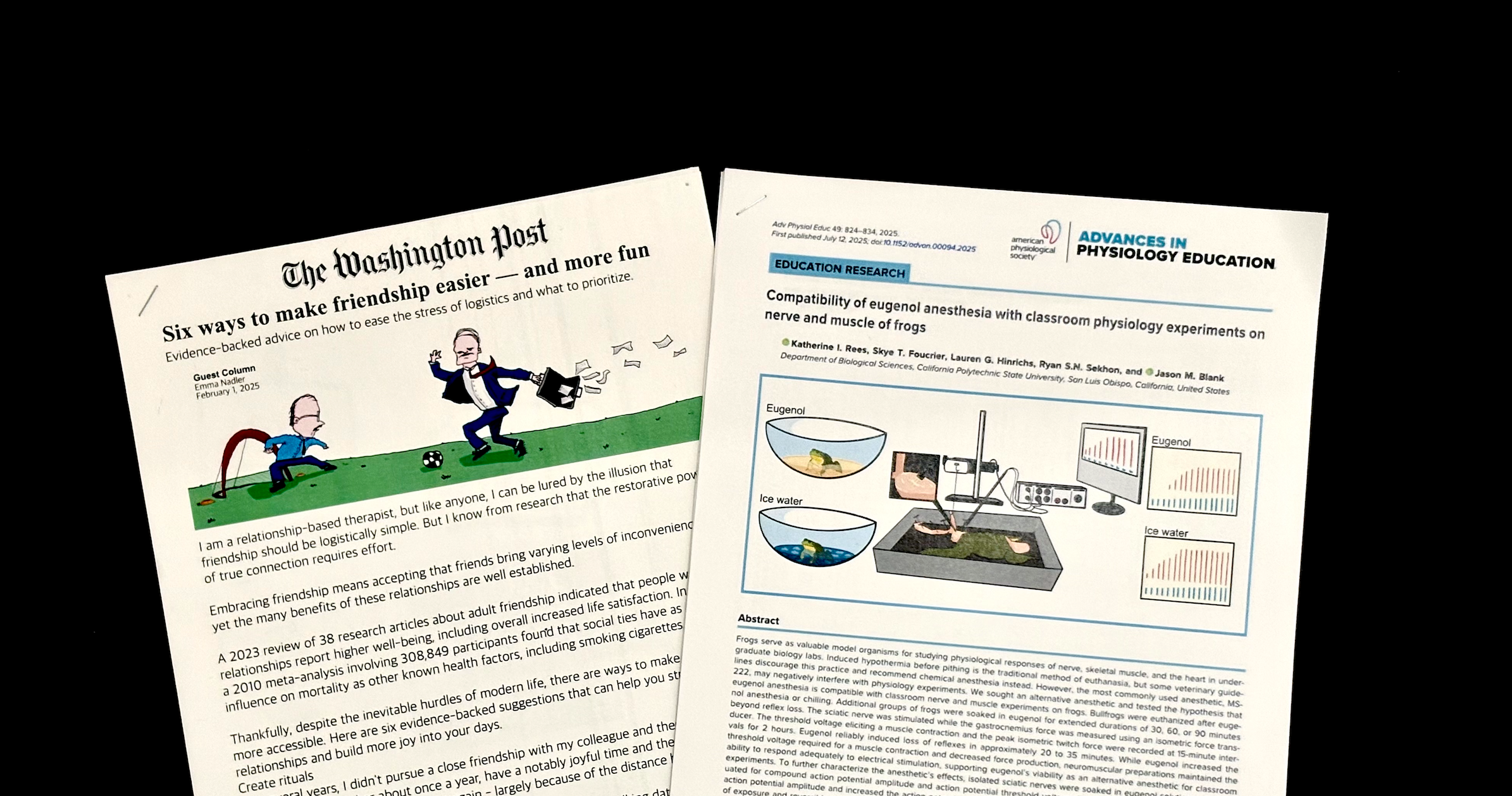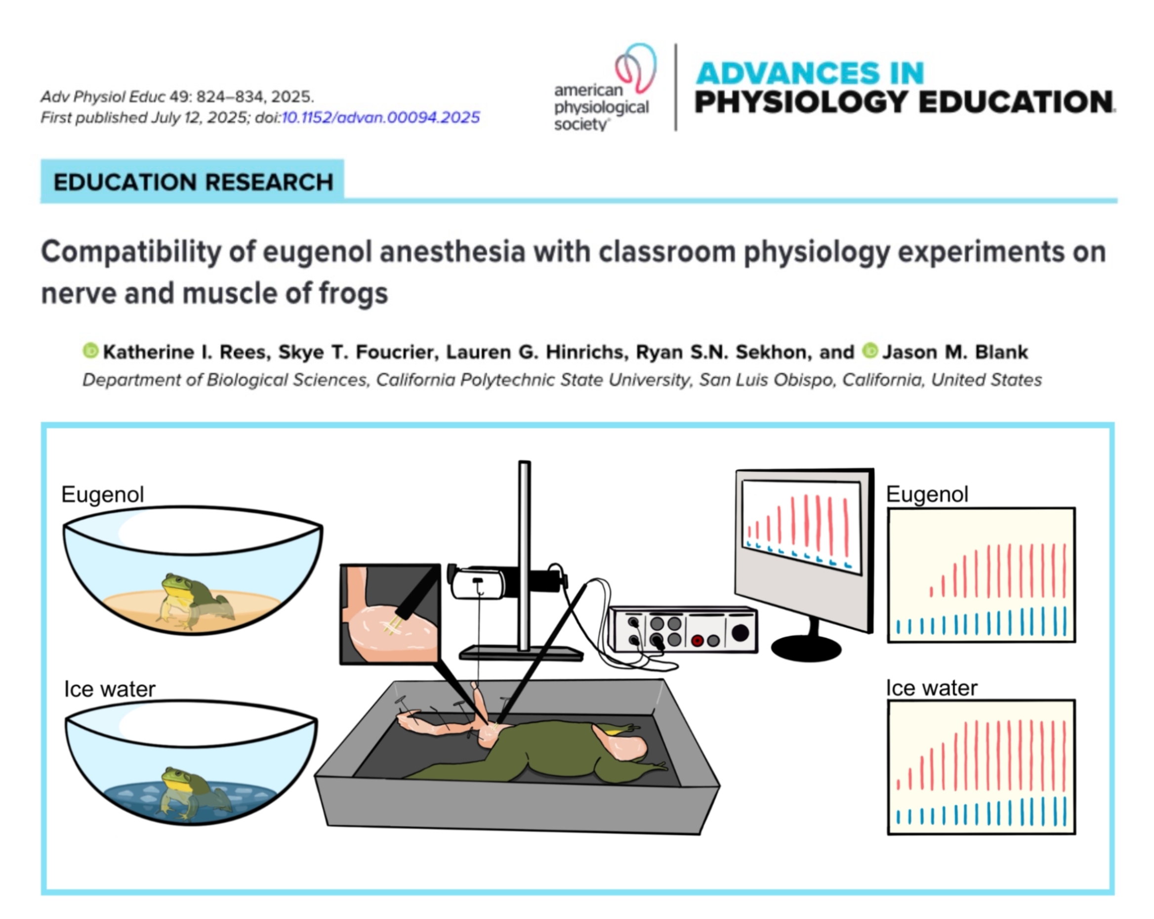 Graphical abstracts are crucial to people's understanding of a research paper. They help people visually synthesize complex subject matter. I designed the graphical abstract for “Compatibility of eugenol anesthesia with classroom physiology experiments on nerve and muscle of frogs.” Rees et. al, 2025: